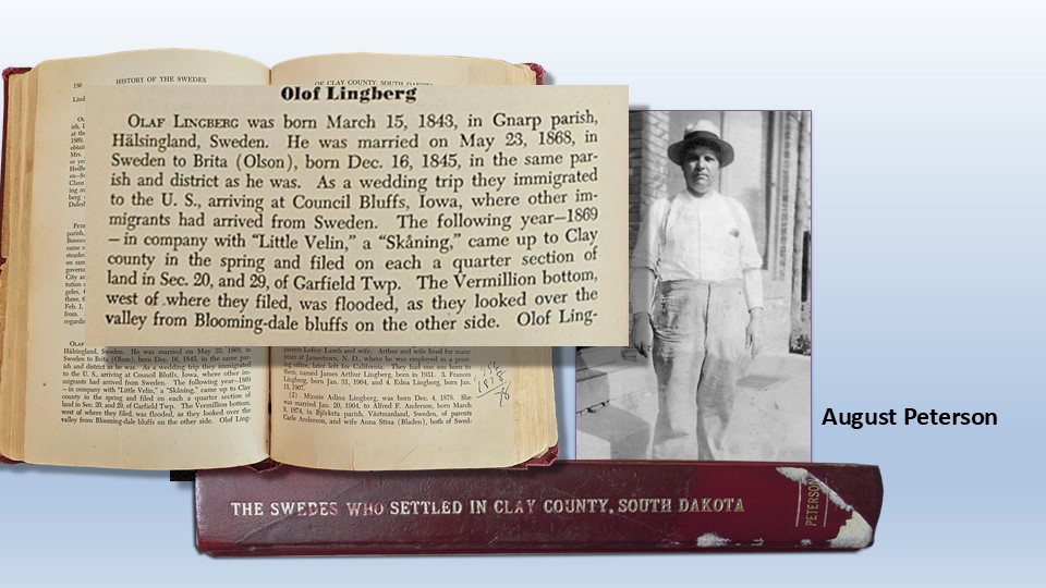 My other Scandinavian great-grandfather, August Peterson emigrated from Namdalen, Norway to South Dakota in 1888. He would marry a Swedish girl, Anna Edlund. August would author the book, The History of the Swedes who settled in Clay County South Dakota. On page 186 he would have only this to say about Olof and Brita’s life in Sweden.