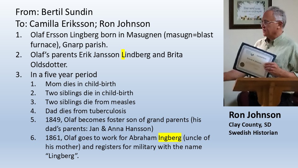 There is no documentation to prove this, but our best guess is when Olof registered for the military he combined the first letter of his parent’s last name (L) with his uncle’s last name (Ingberg) and invented Lingberg, something that he could call his own. It’s pure speculation, but until someone can tell us differently that’s our story.