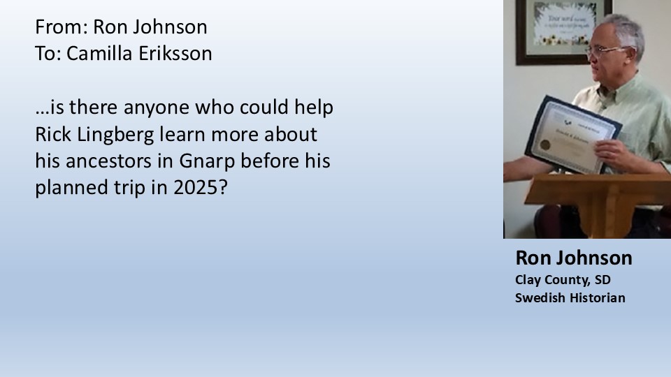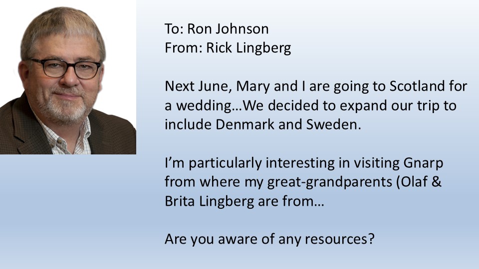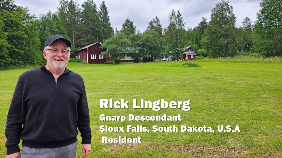 Hello. I’m Rick Lingberg from Sioux Falls, South Dakota, U.S.A. This post is the first of many daily issuances that will follow the journey I made this past July, with my wife Mary, to uncover the story of my Gnarp, Sweden ancestors, Olof and Brita Lingberg. These posts will detail my research process, including correspondence with family historians (both American and Swedish) who aided my journey to discover family connections, sites and records.