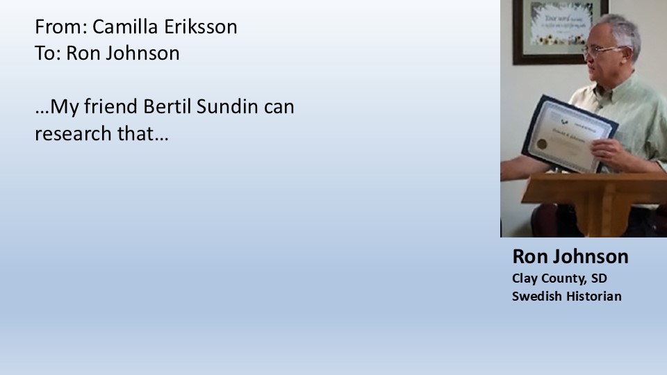 Only a few miles from Olof and Brita’s gravesite at a little country church in Clay County South Dakota lives Ron Johnson, the local Swedish historian and caretaker of August Peterson’s “Swede Book”. I’ll ask him.