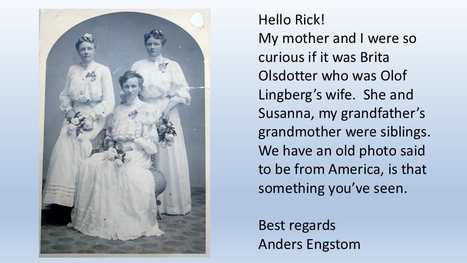 My mother and I were so curious if it was Brita Olsdotter who was Olof Lingberg’s wife. She and Susanna, my grandfather’s grandmother were siblings. We have an old photo said to be from America, is that something you’ve seen.