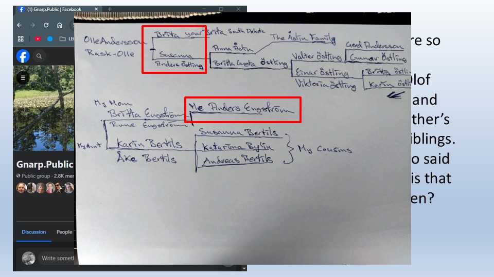 Anders sends his hand-written family tree. It shows my great-grandmother (Brita) and his great-great grandmother Susanna are sisters.