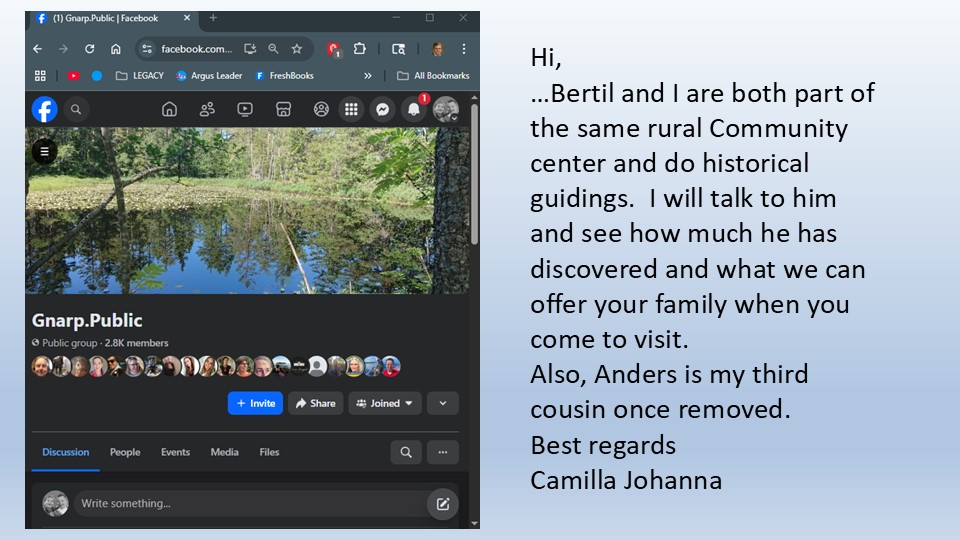 Still no personal connection in Sweden. My wife (Mary) suggests I see if Gnarp has a Facebook page. They do! I post on our planned visit. Many reactions. 1 message…
