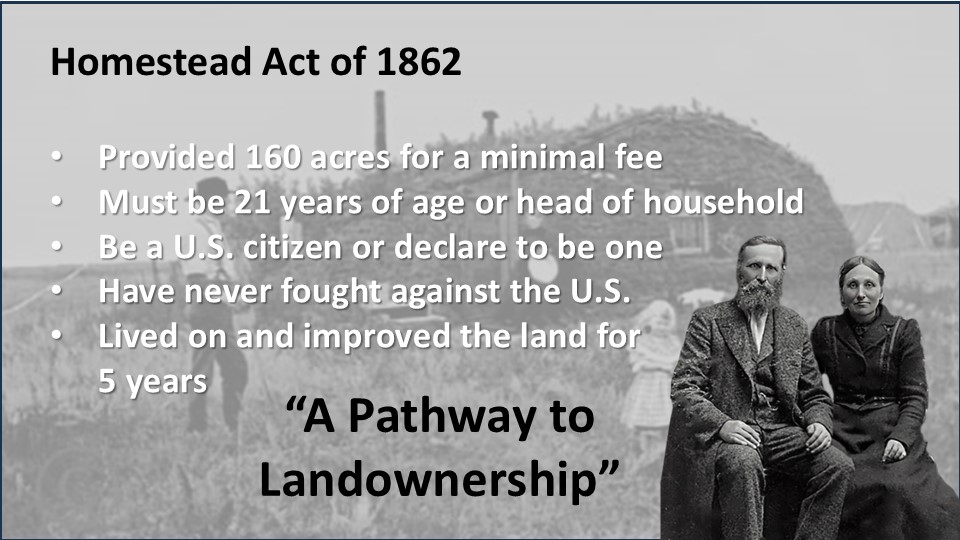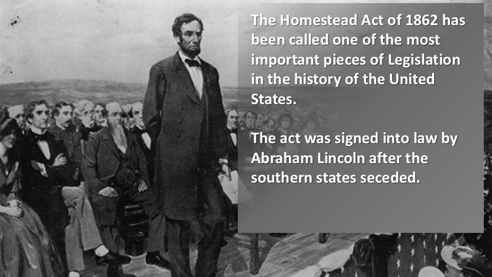 In 1862 America is in the midst of a Civil War when the Homestead Act of 1862 is enacted.