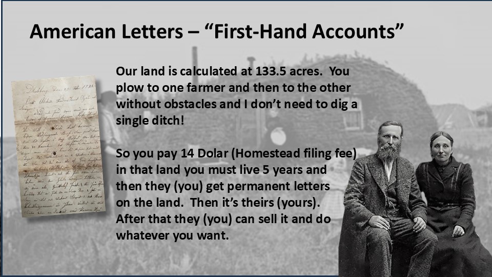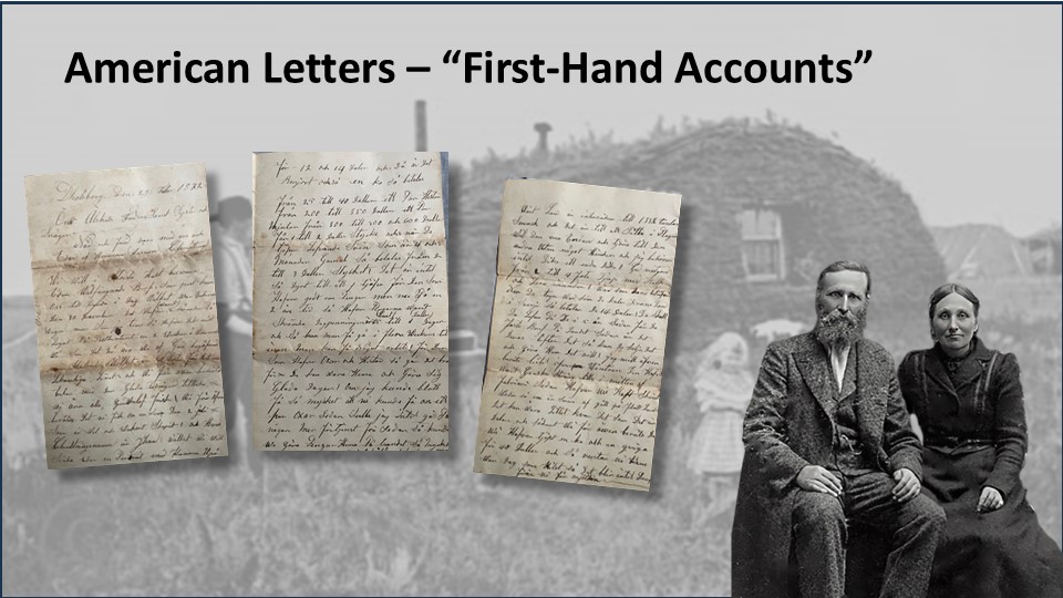 This law turned over vast amounts of the public domain to private citizens. 270 million acres, or 10% of the area of the United States was claimed and settled under this act. It provided opportunities for people like Olof and Brita Lingberg who would otherwise have almost no ability to ever have land of their own in Sweden. It was “A Pathway to Landownership.” They would learn about this chance of a lifetime, primarily, through what we now know as the “American Letters”, correspondence from Swedes who had already made the journey.