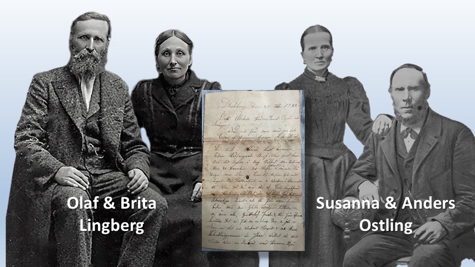 Actual letters from Olof and Brita Lingberg from America to Susanna and family in Sweden. Andreas says he recently discovered them in his mother’s attic. His plans were to translate them from “Old Swedish” to “Today’s Swedish” and then to English. I pleaded, “Certainly you will send me the English version when completed.” He said, he would.